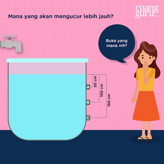 Sekarang, kita coba buktikan konsep ini dengan contoh yang lain ya. Coba kamu pikir dulu, kira-kira, mana keran air yang ketika dibuka akan mengucur paling jauh? Jangan tap gambarnya dulu ya buat liat bocorannya. Coba, dipikir dulu. Kalau pun udah jawab, cari tahu kenapa?